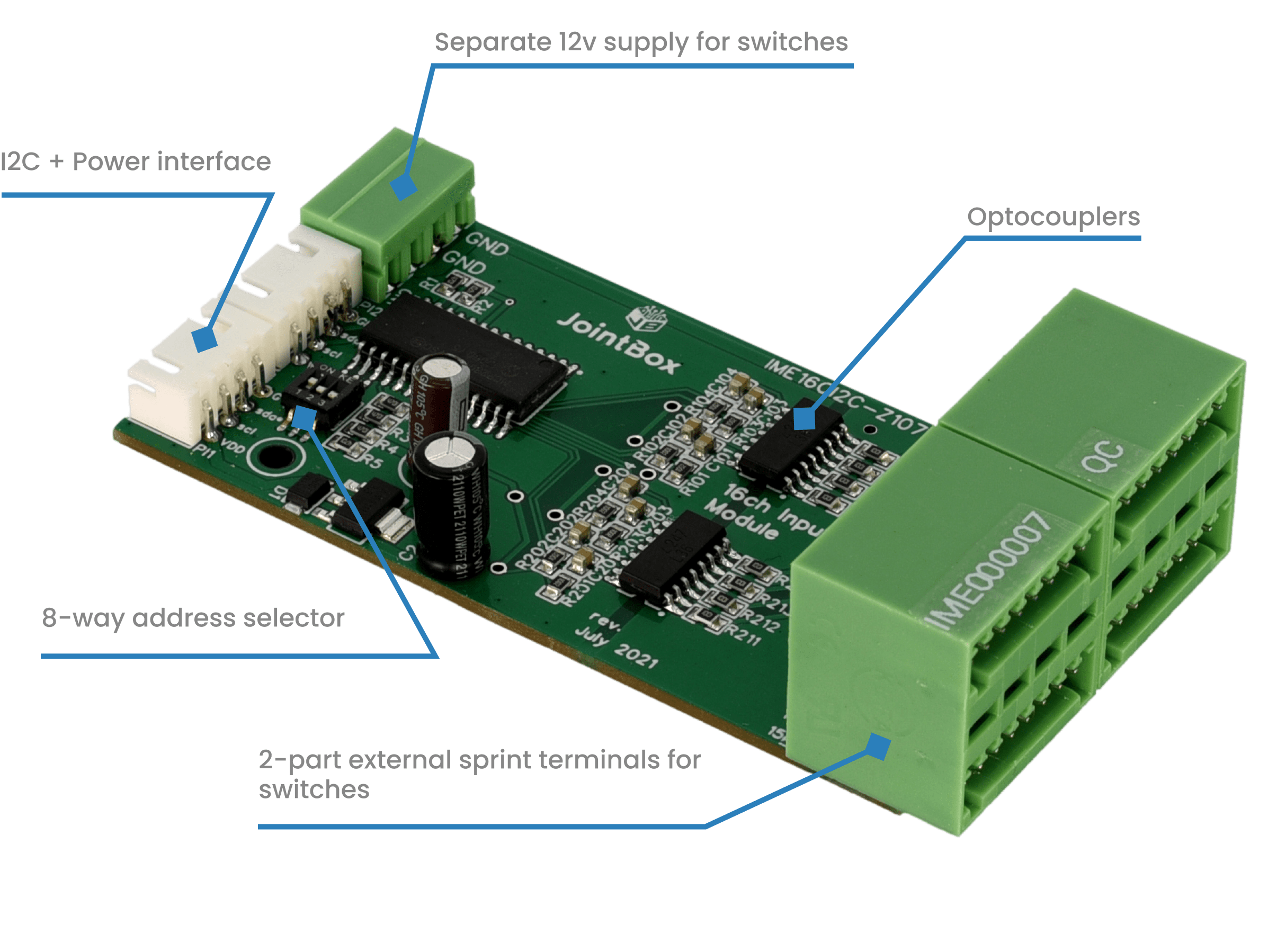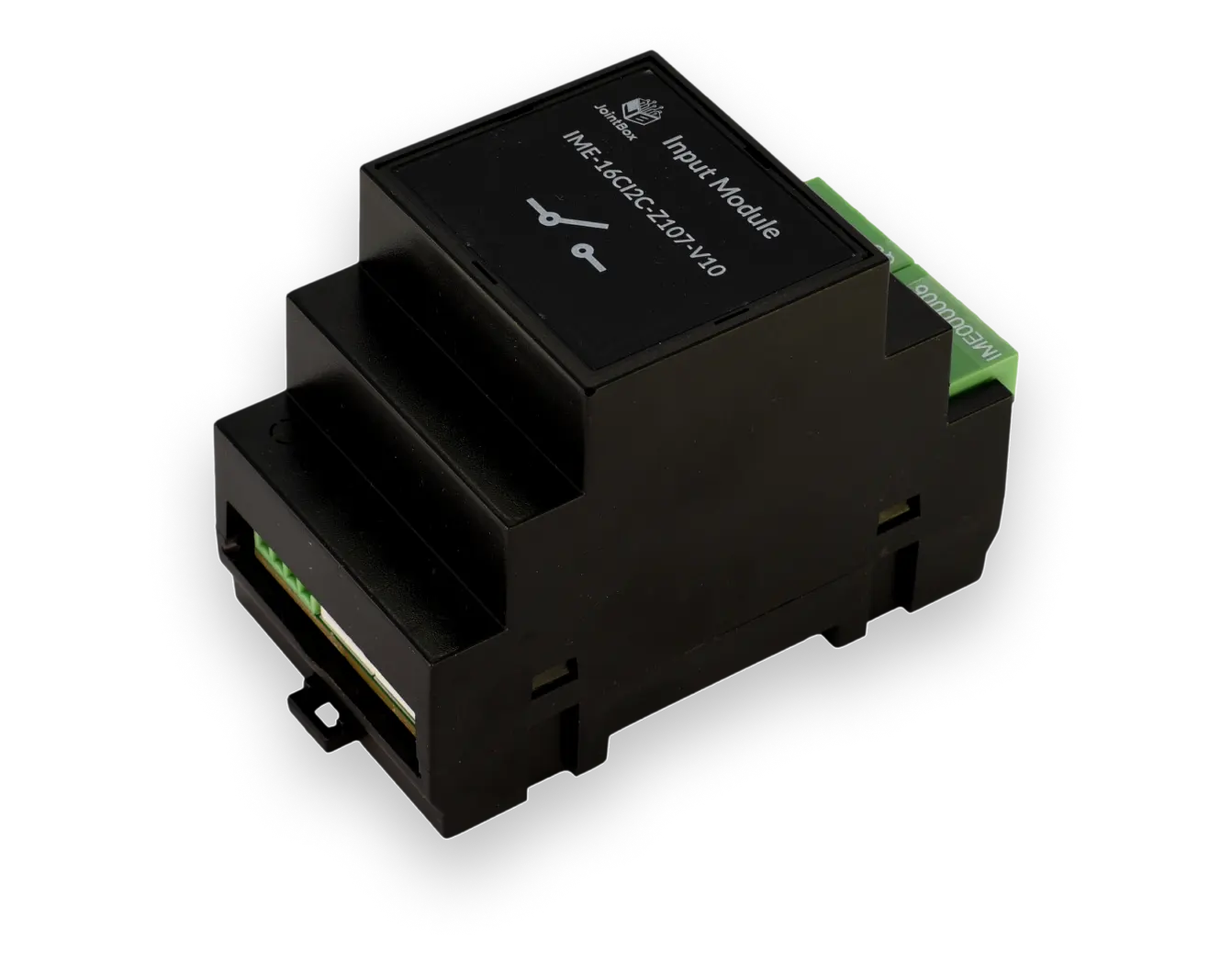 Input Module has 16 channels to connect to any type of binary input device: pushbuttons to emulate normal light switch behavior, limit switches to detect positions of moving parts, reed switches to detect door and window open/close state, or even simplistic pair of contacts to act as a water leak sensor.