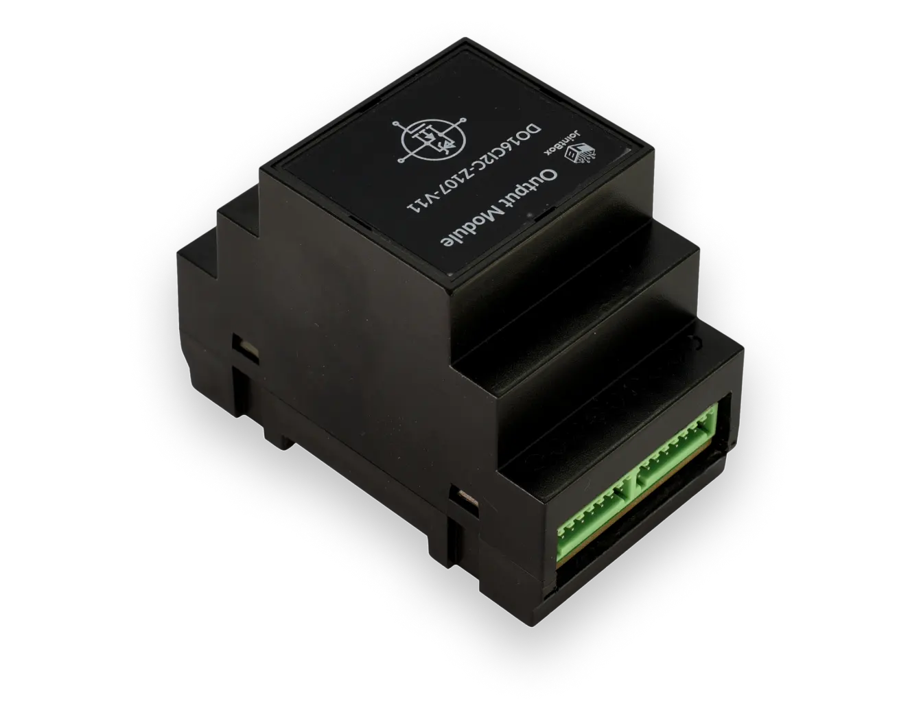 Output Module provides 16 independent channels operated from the Controller module. Each channel is connected to the load via optocoupler and transistor to ensure low output impedance and galvanic isolation.