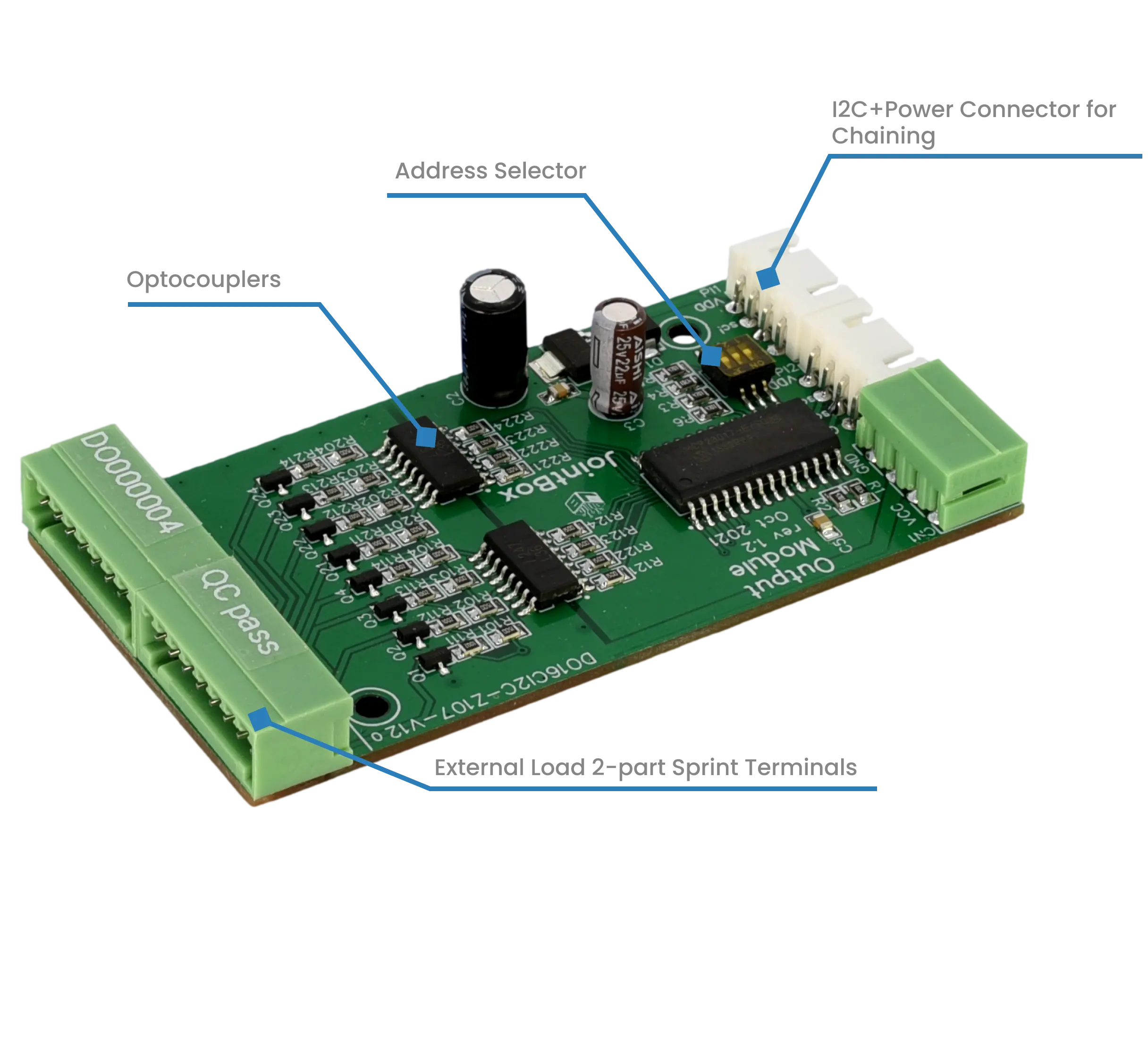 It is possible to connect total of 8 input and output modules total (for example, maximum of 3 output + 5 input). The I2C address selection is performed with a micro on-board switch. Thus, in total it is possible to connect 128 outputs to a single controller